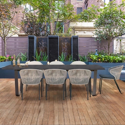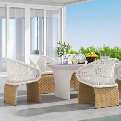 7-Pieces Rope Woven Outdoor Dining Set with Glass-top Rectangle Table and 6 Armchairs